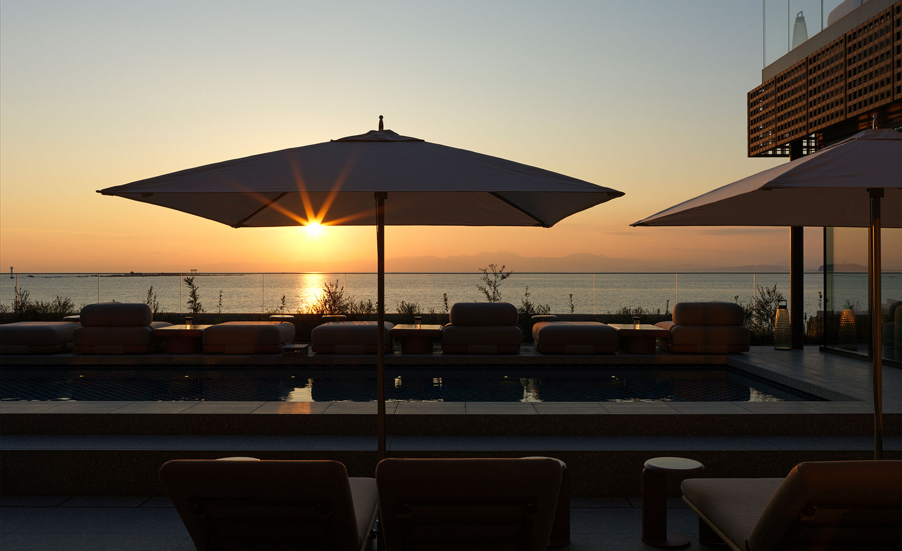 Beyond the pool stretch the sea of Morito, and in the distance, the graceful outline of Mt. Fuji.